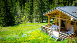 Chalet 5 personnes, de 35 m² + 15 m² de terrasse semi-couverte, séjour, cuisine équipée, lave-vaisselle, refrigérateur, congélateur, micro-onde, cafetière, salle d'eau et WC séparés.